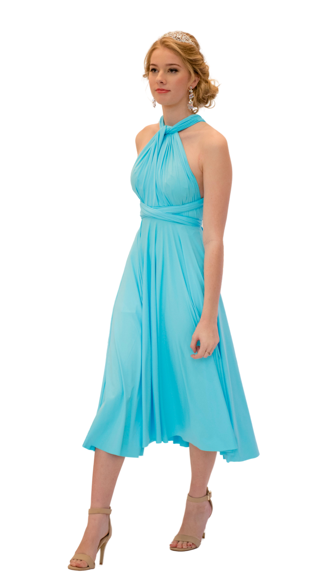 This convertible dress is slightly shorter than a traditional ball gown, perfect for pairing with flat shoes to achieve a relaxed yet polished look. Its multiway design allows you to customize your style for anything from garden weddings and outdoor events to elegant dinners.